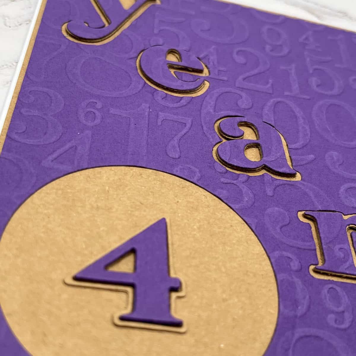 Colors: kraft brown, purple, navy blue and bright blue paper on a white card base