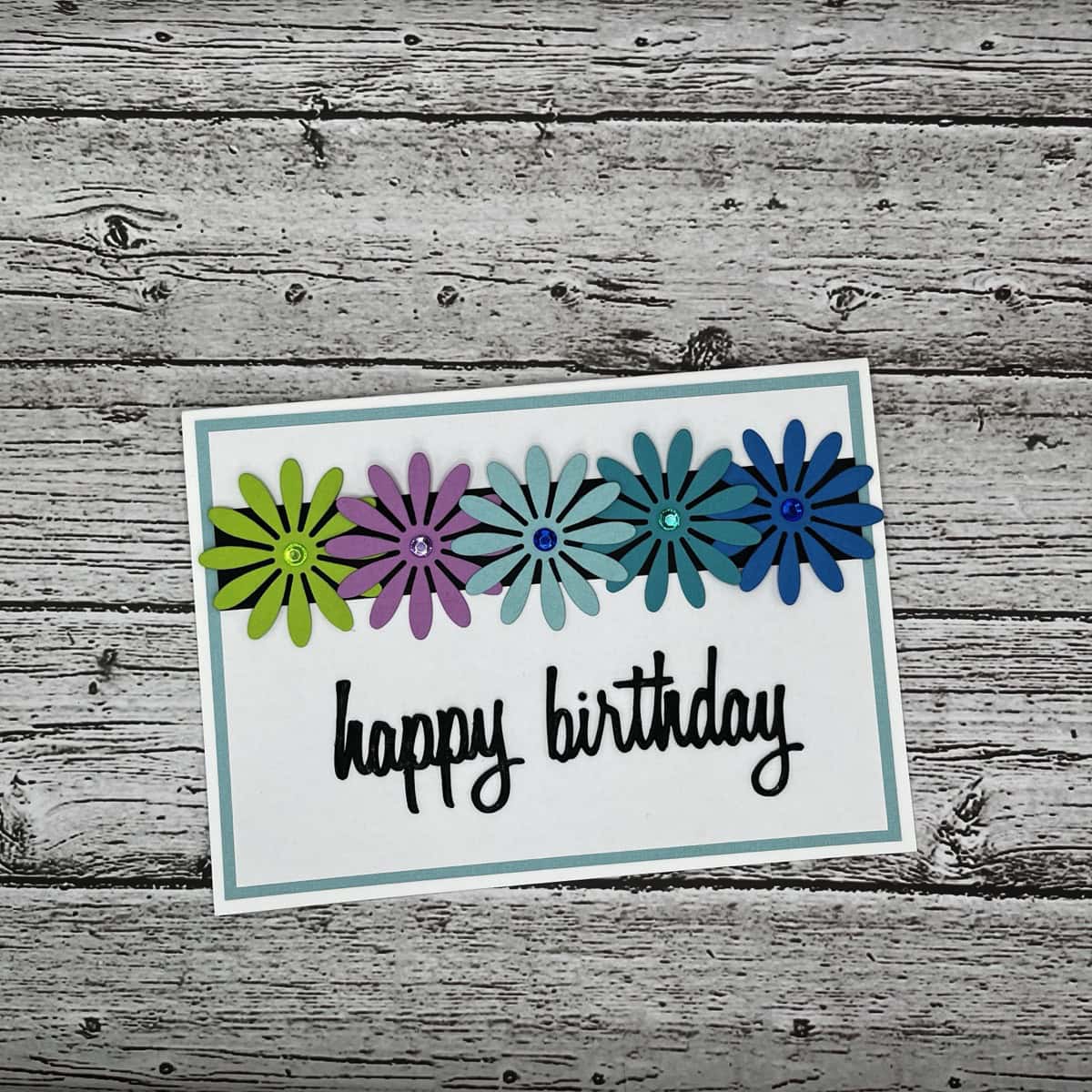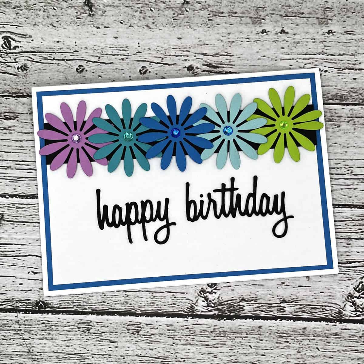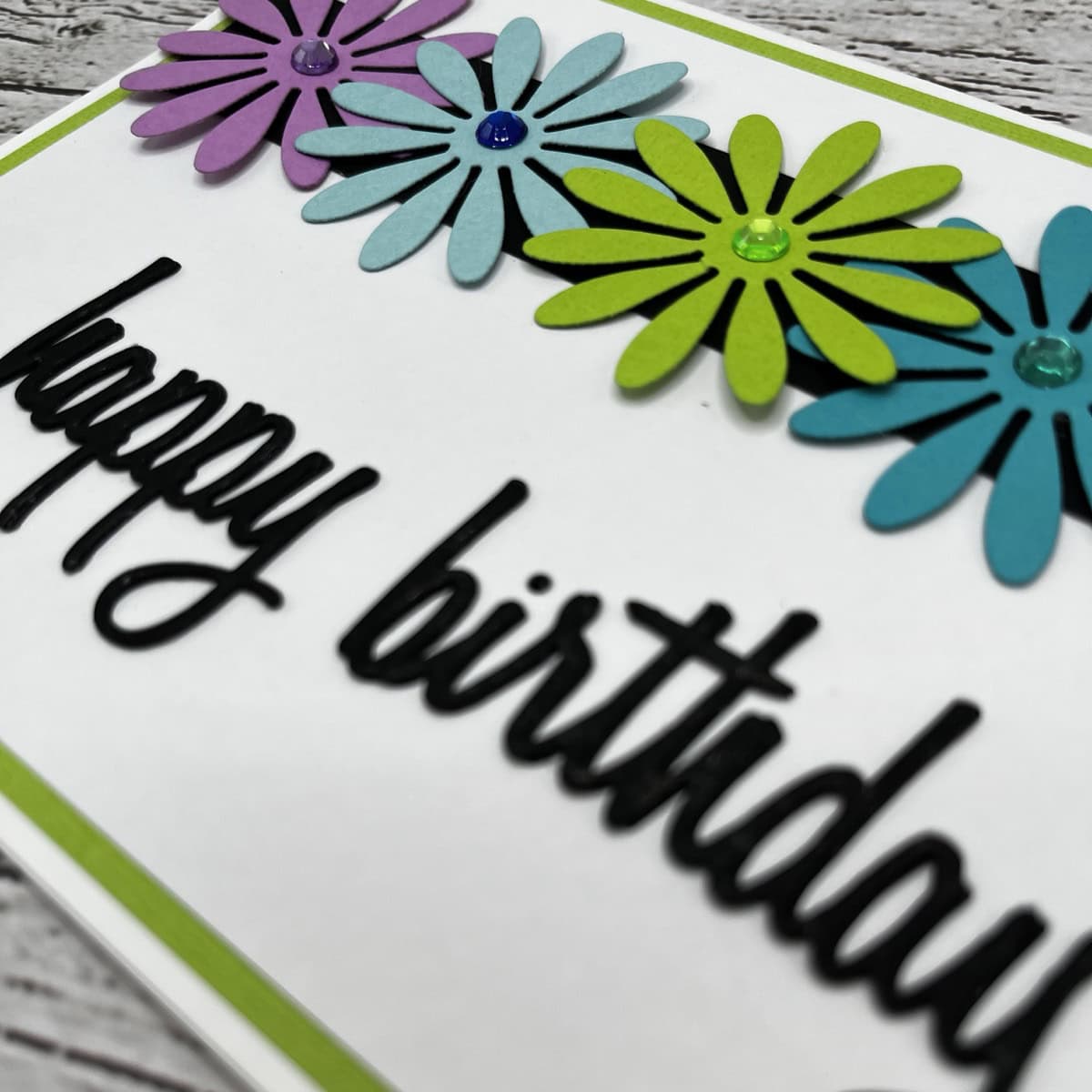 The Daisy Happy Birthday greeting card sends a colorful birthday message. It’s appropriate for any teen or adult. The happy birthday sentiment is stamped and embossed and sits proudly in the center of the card. You can choose from five different colors of the accent panel: wave blue, orchid, powder blue, aqua, or key lime green.