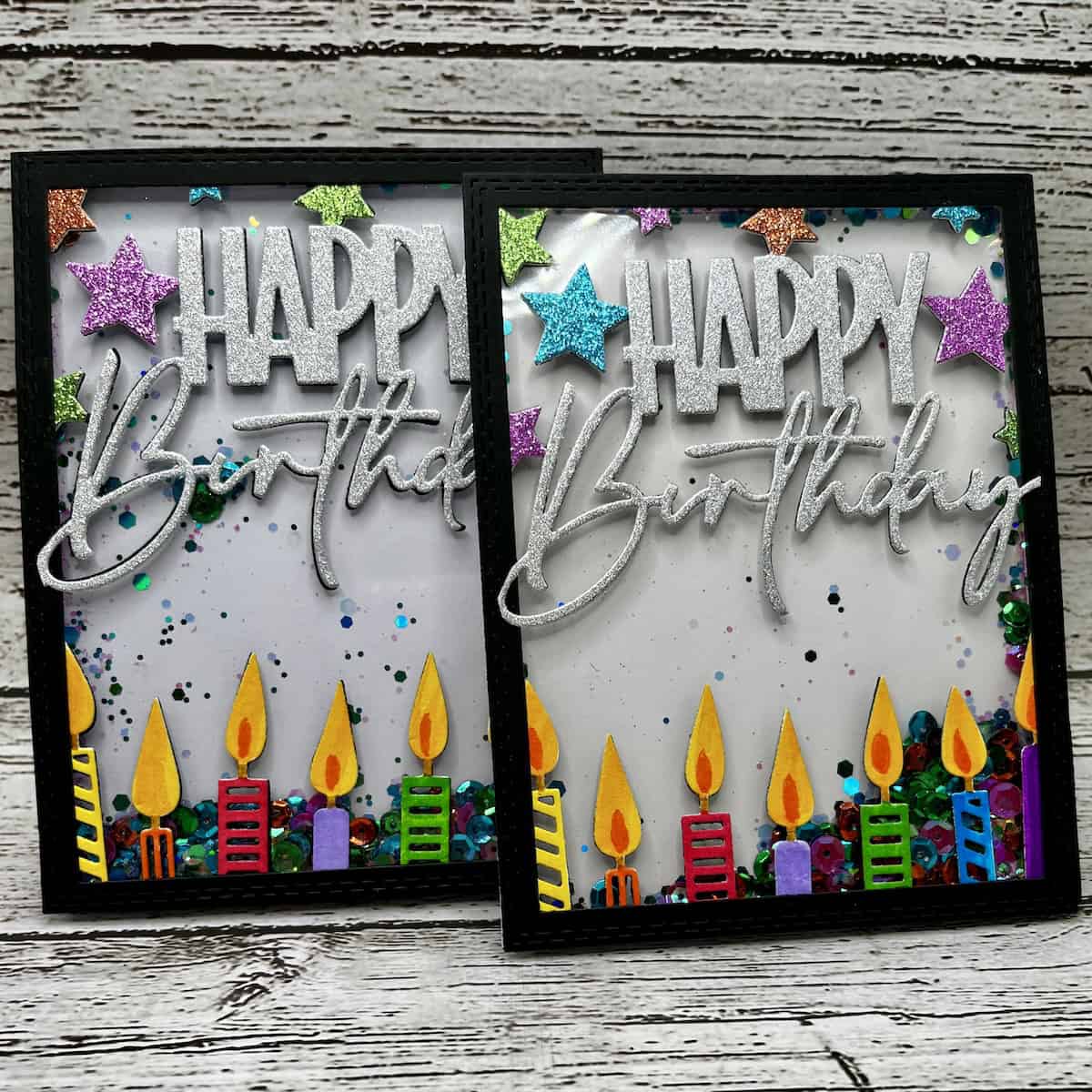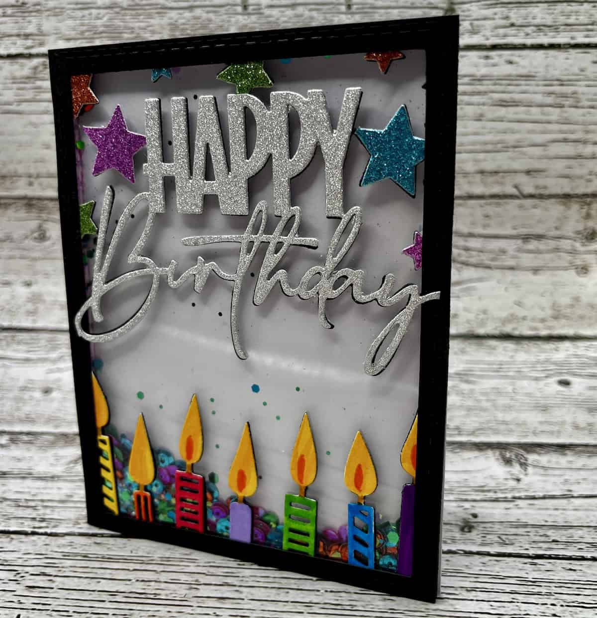 Bright, hand-assembled candles line the bottom of the card, each topped with a glowing flame, while shimmering stars and a bold silver “Happy Birthday” sentiment add sparkle and dimension. The crisp black frame gives the design a polished finish, making the colors pop and the movement shine.
