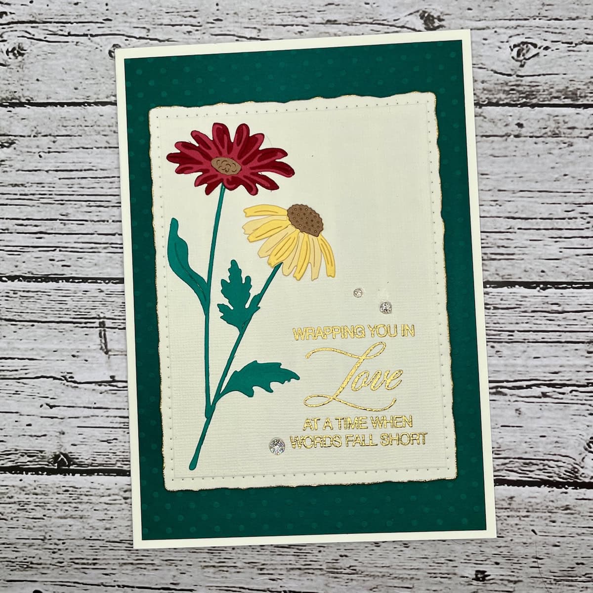 Wrapped in Love Sympathy Card is a handcrafted sympathy greeting card created to express compassion, comfort, and heartfelt support during times of loss. The elegant design features layered floral die cuts with a striking red blossom and soft yellow flower, placed on a textured white panel that highlights the beautifully embossed sentiment: Wrapping you in love at a time when words fall short.